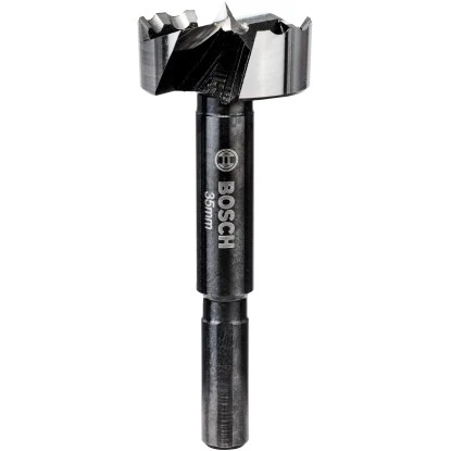 Der Bosch-Forstnerbohrer 35 mm nach DIN 7483 G ist für Hart- und Weichholz sowie furnierte Hölzer geeignet. Der Präzisionsbohrer mit zwei Haupt- und Seitenschneidern sowie kurzer Zentrierspitze aus vergütetem Spezialstahl nach Werksnorm verfügt über eine Schneidenhärte von min. 50 HRC. Der Bohrkopf ist geschmiedet und geschliffen, blank mit schwarzen Nuten und erfüllt hohe Anforderungen bezüglich Schnittqualität und ausrissfreien Bohrlochkanten. Der Forstnerbohrer ist in allen Bohrmaschinen mit 10-mm-Bohrfutter einsetzbar.