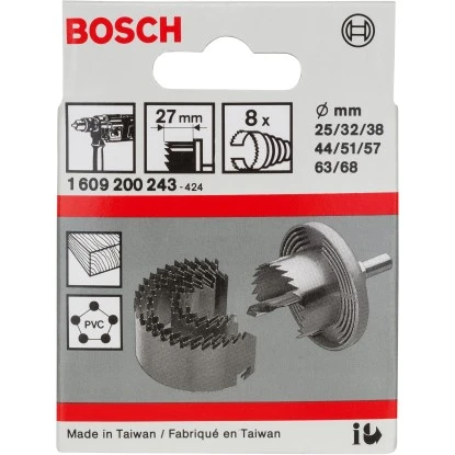 – 8 Sägekränze (Ø 25 mm, 32 mm, 38 mm, 44 mm, 51 mm, 57 mm, 63 mm, 68 mm) mit 27 mm Arbeitslänge