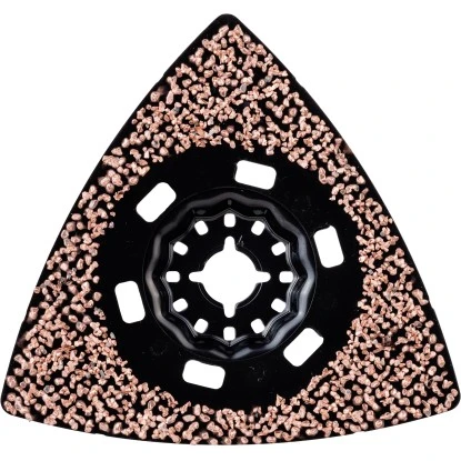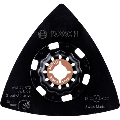 Der Schleifteller Starlock AVZ 90 RT2 Carbide RIFF bietet eine besonders hohe Lebensdauer beim Entfernen von Mörtel und Fliesenkleber. Der Teller ist für hohe die Verschleißfestigkeit und somit außergewöhnlich lange Nutzungsdauer mit hochwertigem Hartmetallkorn der Körnung 20 besetzt. Ein offener Besatz ermöglicht den aggressiven Materialabtrag ohne ein Zusetzen oder Ablagern, womit zusätzlich eine höhere Lebensdauer des Tellers erzielt wird. Mit dem deltaförmigen Teller lassen sich auch schwer zugängliche Ecken erreichen. Dabei ist er ideal geeignet zum Entfernen von Mörtel und Fugenmörtel, Teppichkleberrückständen von mineralischen Oberflächen und zum Raspeln von Holz für grobe Formanpassungen. Es ist kompatibel mit allen Elektrowerkzeugen des Typs Starlock, Starlock Plus und Starlock Max sowie allen gängigen Multifunktionswerkzeugen. Darüber hinaus ermöglicht das Aufnahmesystem durch seine dreidimensionale enge Passung, eine maximale Kraftübertragung zwischen Maschine und Zubehör.